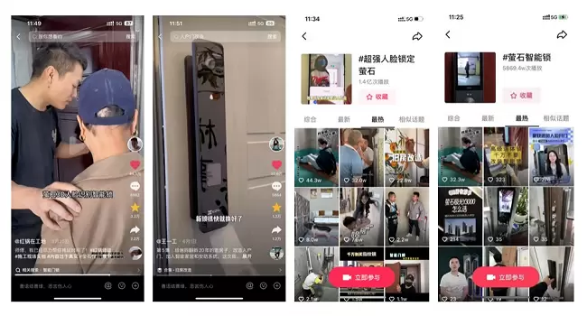 在抖音平台,红锅在工地、老四的幸福生活、王一工等家居装修博主拍摄的萤石智能锁体验视频,点赞评论互动量近两百万。另一面,抖音话题#超强人脸锁定萤石、#萤石智能锁共收获近2亿次播放,在抖音平台“智能锁”热门关键词搜索指数榜单上,萤石智能锁位居行业 TOP1。