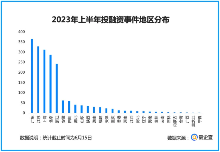 2023年上半年(截至6月15日),从总投融资事件超过200件的前四个广东、江苏、上海、北京等几个地区来看,爱企查分析发现:广东省先进制造业是支柱,智能硬件产业链集群效应明显;江苏制造业、医疗健康吸金力强;上海科技创新力强,医疗健康仍是中坚力量;企业服务、医药健康成北京产业发展双引擎。