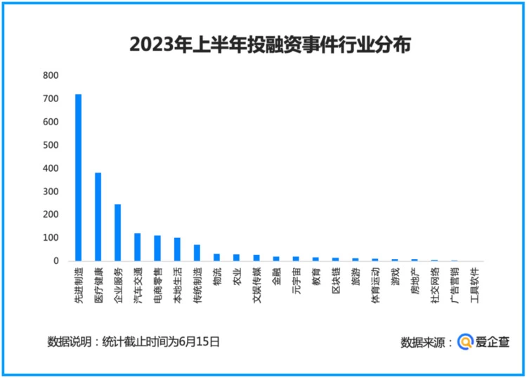 其中,先进制造业以719起,居上半年各行业投融资之首,独占全部融资事件数量的近4成;医疗健康行业仅次于先进制造业,以380起融资事件居第二位;企业服务行业发生245起投融资事件,排第三位。