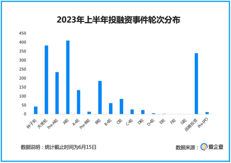 爱企查分析发现,2023年上半年投融资事件以A+轮早期投资为主,超过上半年投融资事件总数6成。A轮、天使轮、战略投资为投融资事件发生的TOP3轮次,其中,A轮最多达410起,天使轮次之为382起,战略投资有339起。