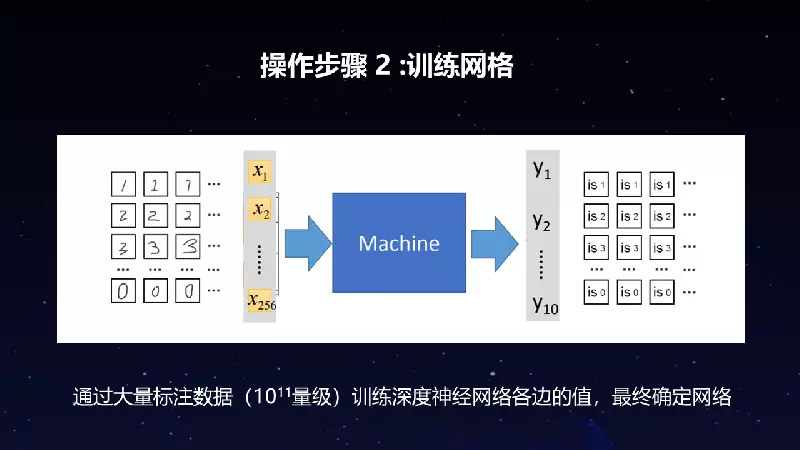 我们准备了大量的手写体“1”的各种变形、“2”的各种变形、“0”的各种变形……这些是图像,每一张图像我们都把它转化成向量(特征),然后把特征输到这个网络里面(右侧为输入);输出我也是跟机器讲好了,比如说第一排的这个数字,无论他怎么写,最后我认为它都是“1”,属于“1”的概率是100%,属于其他数字概率是0;第二行,所有的这种手写的方式,我认为它都是“2”——相当于把这样的输入和输出,明确地告诉机器,去训练这个网格。