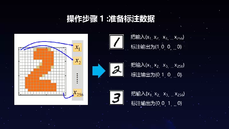 比如说我准备的标准是“1”,它的输出属于“1”的概率是100%;那么它属于其他数字,比如说2345等,它的这个概率为0,它不可能是其他的数字——所以我会准备大量的数据。