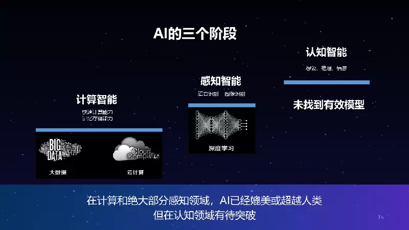 - 第一个阶段:计算智能。大数据和云计算技术的出现,使得计算智能机器已经远远超过人类,比如说Alpha Go;