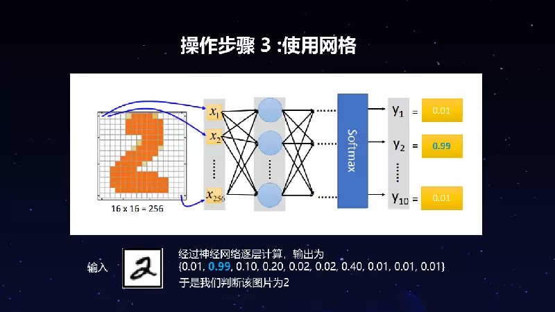 这样逐层算下来后,最后我们认为这张图片就是“2”——实际上,这个网格就可以解决数字识别的问题。