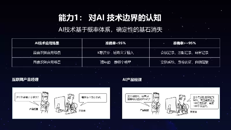 第一个能力模型很重要, AI产品经理一定要对AI的技术边界要有很强的认知——因为你对所在行业技术边界的认知,直接决定了你设计产品的应用场景。如果你对AI技术的认知深度不够高,那么你设计出来的产品要么没人用,要么就累死开发——所以AI技术是一个很重要的特征,这是基于概率体系。