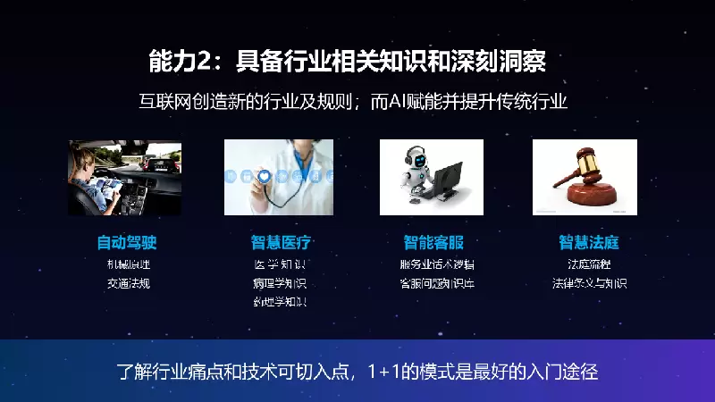 大家一定是要首先理解行业,然后再运用我们的聪明才智,把AI和领域融合起来。因此,这就提出来——了解行业的痛点和技术的可切入点,1+1的模式是最好的入门途径。
