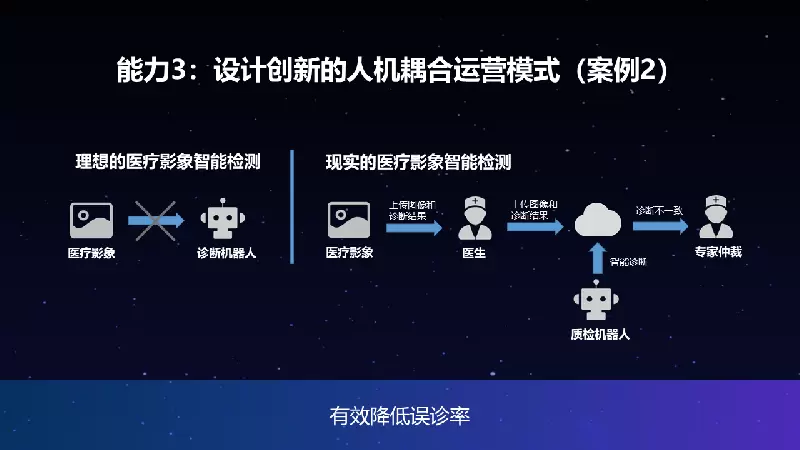 如下图左侧是我们理想中的模型:医疗这个机器人诊断医疗图像传进来,机器人给结果——但是这样的路径是错误的。因为我们是基于概率体系的,而机器人也会犯错;如果你这么去做,那跟以前的做法是一样的。