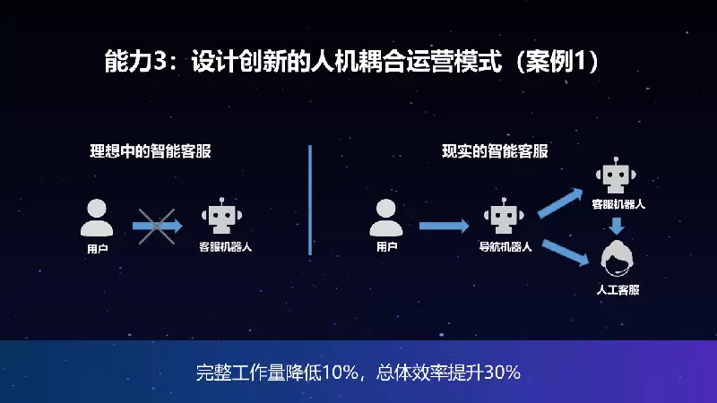 第三点能力,我们称之为“设计创新的人机耦合运营模式”,AI时代的这个运营模式也是需要创新。