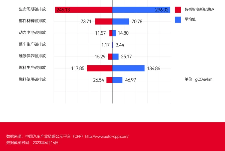以“C级插电式混合动力MPV”级别为例,在3个车系共11款不同销售型号车型中,传祺智电新能源E9在电池、电机、电控领域优势突出,具有核心专利的机电耦合系统、弹匣电池和智能能量管理系统,整车碳足迹为246.13克二氧化碳当量每千米(gCO2e/km),行业均值为296.02克二氧化碳当量每千米(gCO2e/km),比行业均值低16.9%。