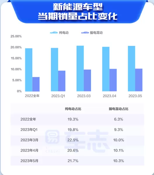 “易车志”聚焦解读5月乘用车市场,对外发布5月乘车市场运行报告(以下简称“报告”),数据来源于全国乘用车交强险新增上险量,根据报告显示:5月销量同环比双增,新能源占比仍在32%徘徊。同时,比亚迪发力,月销再破20万辆,自主品牌占比重回48%。但是乘用车市场下月同比或现大幅下降。