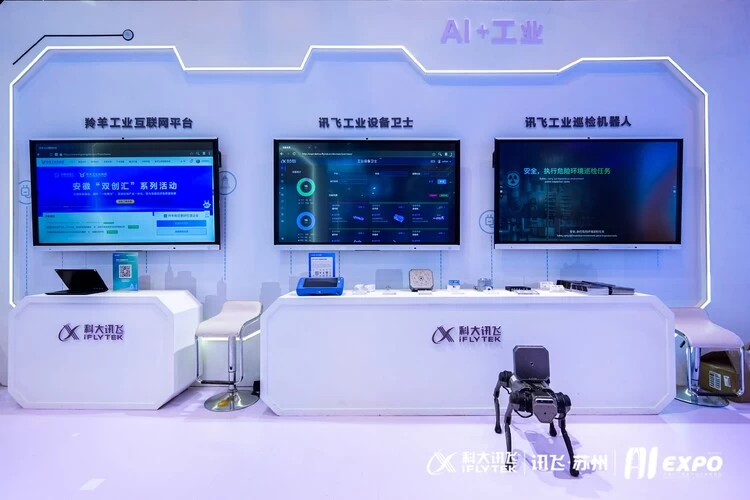 此外,AI+城市带来建筑超脑和城市超脑,让建筑更有生命力,城市治理更高效;AI+教育领域,讯飞AI红外智慧黑板和科大讯飞AI语文本,让教育更智慧,让孩子爱上语文;AI+工业,巡检机器人、声学成像仪、羚羊工业互联网平台等等,赋能产业转型升级;AI+虚拟人成为人类伙伴,助力各行各业生产;AI+机器人,四足机器狗上下台阶行动自如,接入“星火大模型”的服务机器人则具有强大的人机交互能力。