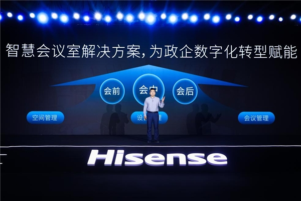 除了海信Vision Hub智慧平板新品外,海信商用显示还带来了海信智慧会议室解决方案。以会议管理平台、信发智控平台、音视频云平台为底座,以海信VisionHub智慧平板为核心,融合多设备终端,打通从会前会议预约、会中使用、会后纪要输出,以及空间管理、设备管理的全流程,为用户提供稳定、高效、便捷的会议体验。