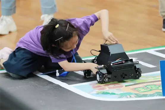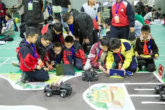在NOC大赛“智能驾驶”赛项的现场,选手们被分为小学、初中、高中三个组别,通过创造栗无人驾驶V1智能车完成各种赛项任务。在竞争激烈的赛场,选手们需要运用人工智能知识并融合多学科学习,多角度地寻找解决问题的思路和方法,不断的调试、测试、编程等操作,让V1智能车能够灵活地穿梭在赛道上,模拟真实的道路行驶路况,完成自动驾驶上坡、下坡、直行、转弯、减速慢行,以及各种常见的交通标志识别任务。