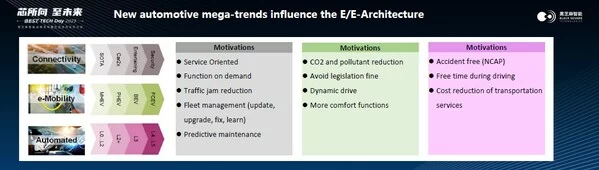 现在,主机厂对用户追求的舒适驾舱体验都需要通过软件来实现,其中包括了对听觉、视觉、触觉等全方面需求的满足。随着整车电气化的到来,电子电气架构面临着新的挑战;另外,目前被行业热议的自动驾驶,正在从L2+向更高的L3和L4做技术更新迭代,大量的数据处理和传感器融合都需要整车的电子电气架构配合演进。
