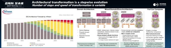 过去常用的汽车电子电气架构中,各个模块各司其职地完成各自的任务。在现阶段混合式架构中,会有单独的域控制器。下一步的演进方向是采用中央电子控制单元,即Central ECU,在这种架构下,数据在哪个阶段处理,决策在哪个模块里实现,有多种不同的实现方式,随之对应不同的架构。再下一阶段的架构将是整车中央全处理器,即Full Car Computer。这对下一代的芯片提出了更高要求,即需要由"一个大脑"控制大部分的数据处理,融合和决策。英飞凌已经预见到整车电子电气架构的改变,主动与主机厂进行合作,通过了解主机厂在电子电气架构的技术路线及系统需求,更好地完成芯片的定义。