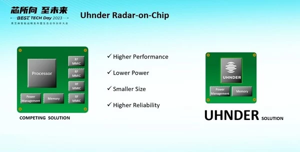 通常情况下,车载雷达要达到主机厂所要求的分辨率,需要多达6颗芯片,包括收发芯片、处理器、ADC芯片。Uhnder提供更高性能、更低功耗、更小尺寸、更具成本优势的4D数字成像雷达解决方案,也能够帮助雷达生产制造厂商实现产品可编程化和定制化。