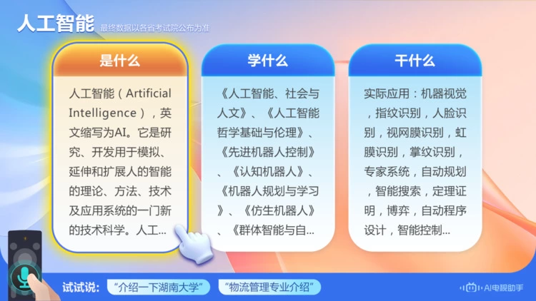 2023年,全国高考成绩的出炉和各地分数线的公布引起了广泛关注。为了帮助考生和家长更好地进行高考志愿填报,湖南电信与科大讯飞联手推出了AI志愿助手。考生和家长通过语音遥控器,可以在湖南电信互联网电视上快速获取历年省控线、高校分数线、大学院校以及专业等志愿填报参考信息。