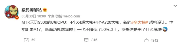 对此,知名科技媒体极客湾认为,天玑9300采用的全大核CPU架构,其实这种狂堆规模的做法论能效的话,大规模低频确实有助于中高负载下实现更强的能效。要是能优化好低负载,就不乏竞争力。至于砍小核我倒是不意外,苹果很早就都是大核当小核用,安卓迟早也会往这个方向走。只不过4个X4确实是让我大为震撼了。如果极限性能这么激进的情况下,日常也能控住功耗,那确实挺值得期待的。