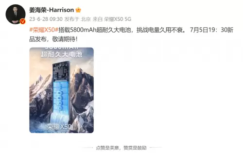 从荣耀姜海荣的灵魂拷问,再结合荣耀X50海报中“拆耐久大电池”的Slogan,可以推测荣耀X50的电池将会加入黑科技,主打一个电池长寿命。目前有博主表示,荣耀X50手机的电池的“超耐久”特性很惊人,也就是用户长时间使用之后手机电池性能的下降幅度将会远小于同档位产品,让用户的手机电池更耐用。不仅如此,还有消息称在7月5日荣耀X50发布会上,还会面向用户公布一项专属福利。