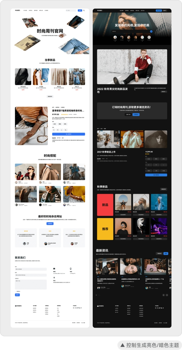 相较于月前发布的版本,即时AI本次更新则聚焦于生成结果的优化,一方面通过语言描述,可以精准控制即时AI生成亮色与暗色模式的设计稿,适配更多的业务场景与审美风格,另一方面,则通过支持直接输入 HEX 色值,生成指定主题色的 Web 设计稿,使生成结果更符合实际需求。