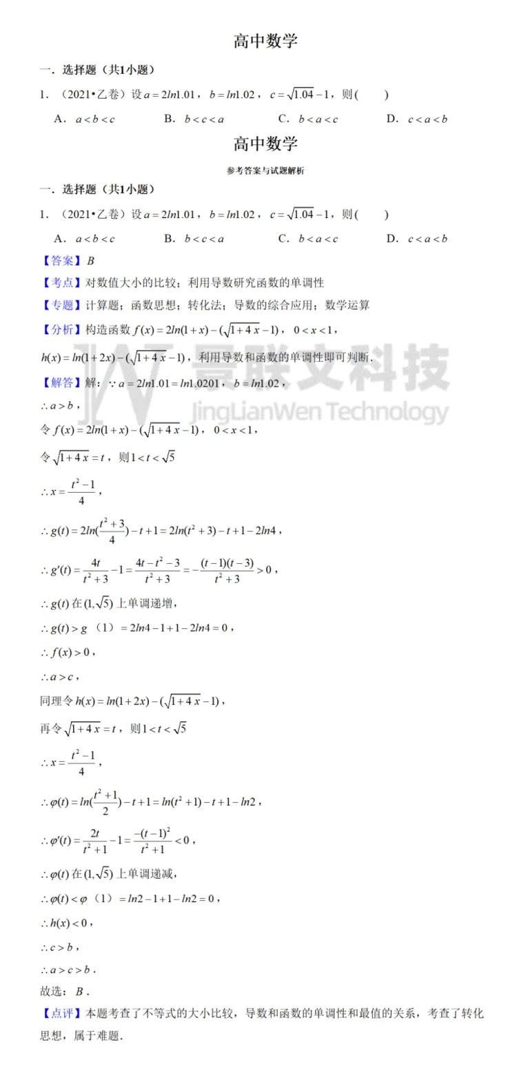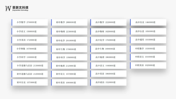 截至目前,景联文科技数据库题量总计8000多万道,试卷总量180万套。所有题目均提供word可编辑版本、json格式。