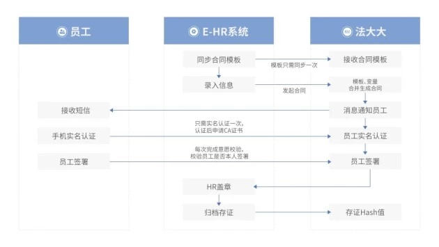 法大大电子签,通过API接口对接E-HR系统,在入职办理及劳动合同变更(续签)流程审批过程中,提供合同模板管理及电子劳动合同签署、电子签名签署等服务,而在证明文件自动申请环节,法大大电子签肩负着证明模板管理及电子印章生成的服务使命。
