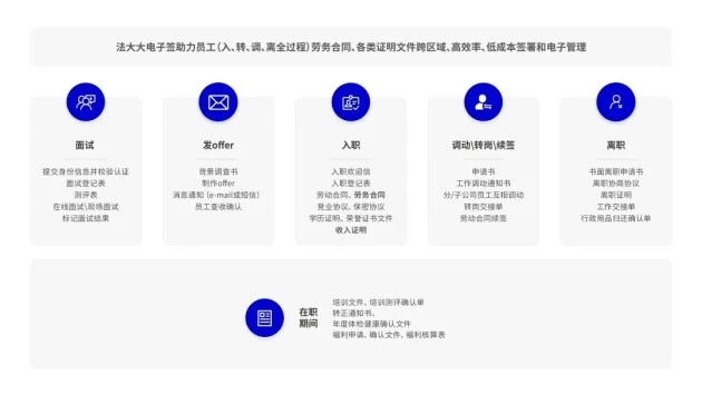 法大大电子签助力员工(入、转、调、离全过程)劳动合同、各类证明文件跨区域、高效率、低成本签署和电子管理。