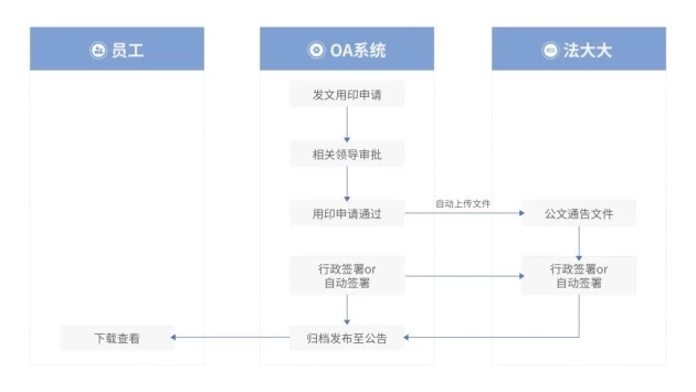 行政人员可直接在OA系统内发起用印申请,待用印审批通过后,调取法大大文件上传接口,生成公告等文件并发起签署,可以实现手动/自动签署后归档,行政人员再按时发布到相关公告栏中,供企业员工浏览下载。