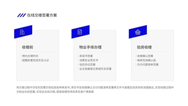 将房屋交付全流程转移到线上进行,解决了传统线下交楼需要面临的业主排队时间长、售楼方需要准备的资料多、业主现场资料签署时间长、签署统计困难、文件扫描归档繁琐等问题。