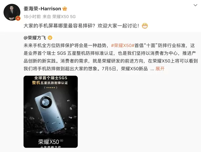 在手机防摔上,荣耀的脚步从未停止。方飞26日发博,未来手机全方位防摔保护将会是一种趋势,首倡手机“十面”行业防摔标准。姜海荣转发了方飞的微博,并向网友发问:“大家的手机屏幕哪里最容易摔碎?”。有理由相信,荣耀X50对手机屏幕最容易摔碎的问题应该有了解决之道。