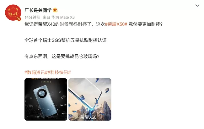 对此,有博主表示,“荣耀X40的时候就很耐摔了,这次#荣耀X50#竟然要更加耐摔?”