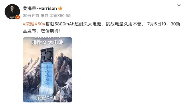 最近,荣耀X50搅动着手机江湖的一池春水。28日,荣耀中国区CMO姜海荣发博,“#荣耀X50#搭载5800mAh超耐久大电池,挑战电量久用不衰。7月5日19:30新品发布,敬请期待!”。可以看出新品在电池续航和耐久性上信心满满,这也回应了其早先“大家的手机一般都是用了多久后,电池开始不耐用的?”灵魂之问。
