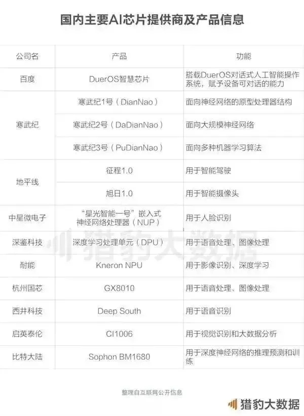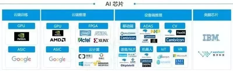 设备端推理:高通(移动端)、深鉴科技(机器人)、寒武纪科技(移动端、CV、机器人)、地平线科技(CV、机器人、语音)、FaceOS(CV)、思必驰(语音)、声智科技(语音)、云知声(语音)、启英泰伦(语音)、耐能(IoT)、NovuMind(IoT)、微软(VR)、华捷艾米(VR)、IBM(类脑芯片)、西井科技(类脑芯片)