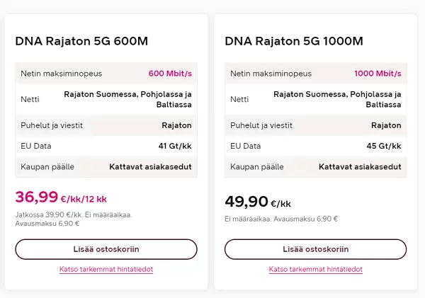 芬兰运营商DNA提供的5G速率计费套餐