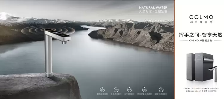 面对电热水龙头的市场增量需求,但质量不合标、技术停滞的市场现状,COLMO AI智能龙头通过立于巍峨壮观的高山丘壑与大海,宛如一幅行云流水的水墨画,让用户从视觉充分感受“超感知全面屏”“滤芯寿命监测”的产品功能。龙头如水之泉眼,飞流直下三千尺般落入瀑布中,视觉震撼地表现其“手势感应”的智能化。与自然的融合创新为COLMO打破传统龙头的视觉限制,通过视觉盛宴满足用户对于身份、地位认证的情感需求,区别传统龙头,打造其智能、品质好、时尚的差异化。