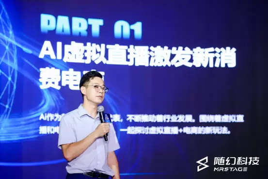 随幻智能科技资深产品经理徐方烨则在分享中对“随幻易直播”产品进行了更为详尽的介绍。徐方烨表示“随幻易直播”产品想要达成的效果,是人人都能用简单轻量的方式一键搞定高品质的虚拟演播内容。为此,”随幻易直播“中的软件系统具有零门槛操作、3D自由编辑、海量素材库、AI数字人、智能运镜等强大功能,让用户以最简便的方式和最低的成本轻松完成优质3D虚拟直播,让直播内容在同质化的泥沼中冲出突围,实现降本增效。