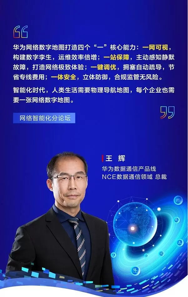 在主题演讲环节,华为数据通信产品线NCE数据通信领域总裁 王辉携手产业、企业客户与伙伴,发布“网络数字地图解决方案”,分享行业优秀实践,助力千行百业数字化转型,加速IPv6+产业创新发展。