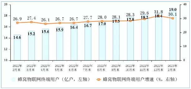 今天工信部发布了2023年1-2月份通信业经济运行情况,统计显示:三大运营商发展蜂窝物联网终端用户19.05亿户,比上年末净增6004万户,占移动网终端连接数(包括移动电话用户和蜂窝物联网终端用户)的比重达52.9%。