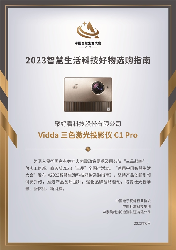 日前,在首届CIC中国智慧生活大会上,Vidda三色激光投影仪C1 Pro凭借过硬的产品力和市场表现在同类产品中脱颖而出,成功入选由中国电子视像行业协会、中国标准科技集团和中家院(北京)检测认证有限公司联合颁发的《2023智慧生活科技好物选购指南》。