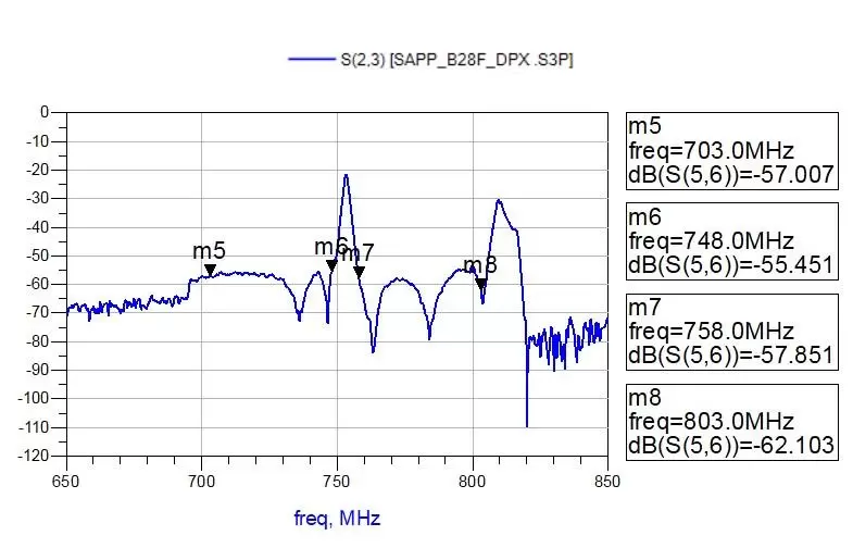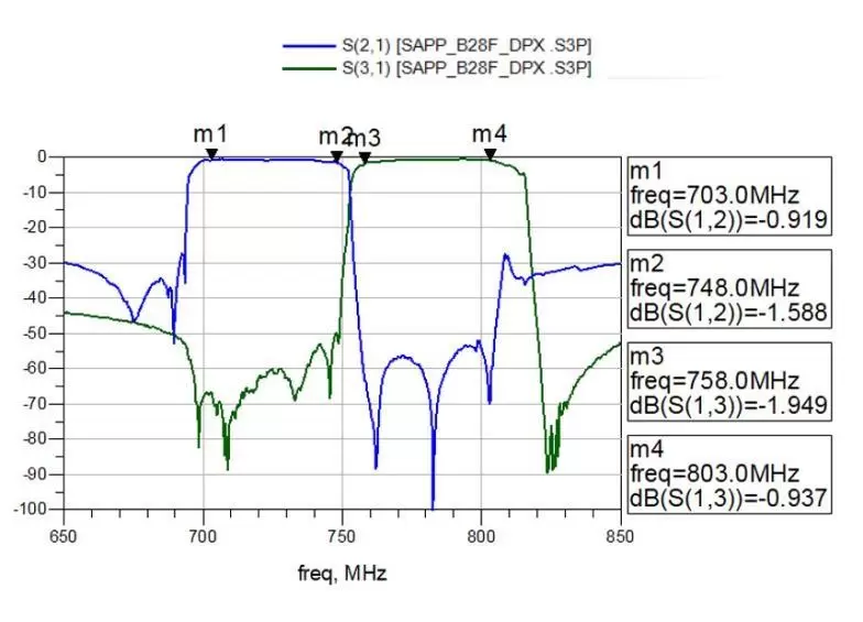B28F双工器拥有高Q值、低损耗、温漂小、高耐功率等特性,其输入功率达到31dBm@5000h, 50℃,在关键指标处的温漂系数更是接近于0 ppm/k,TX带内插损-1.6dB,RX -2.0dB,隔离-55dB以上,B28F双工器带内插损、带外抑制和隔离度均表现优异,综合性能指标国内领先,并比肩国际一流产品。