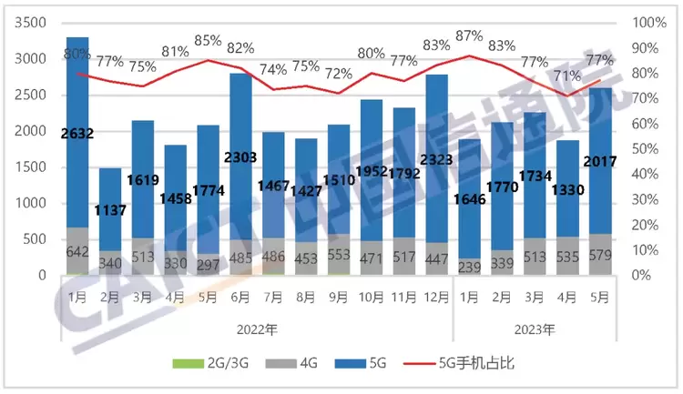 图:国内手机市场出货量及5G手机占比(来源:中国信通院)