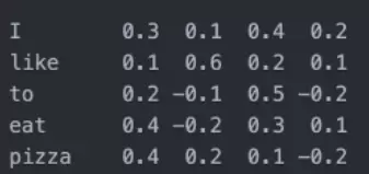 例如, "I like to eat pizza" 这句话,在我们人类的眼中极为简单,但在计算机眼中,它会被解构成每一个单词对应的向量。如下: