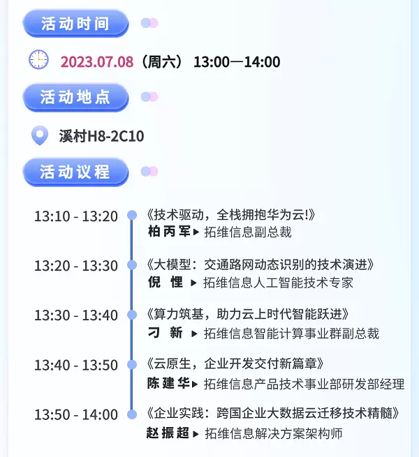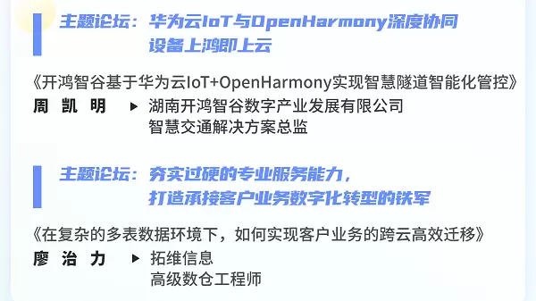 大会设置200多场专题活动,设置多元化议题,通过多形式技术研讨,分享热点技术创新实践,洞察未来发展趋势!拓维信息旗下开鸿智谷智慧交通解决方案总监周凯明、拓维信息高级数仓工程师廖治力分别受邀参与主题论坛,分享开源鸿蒙+华为云IoT落地智慧交通的实践经验以及云高阶服务迁移、多场景数据库迁移的项目实践经验。
