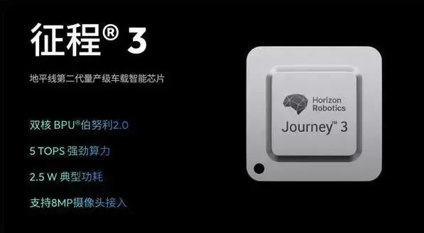 据了解,征程3芯片,是地平线第二代车载智能芯片,基于自研的BPU伯努利架构打造,单芯片算力5TOPS,典型功耗仅2.5瓦。