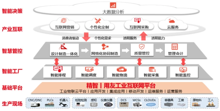 顶层是以大数据分析为主的智能分析、智能决策;第二层以互联网营销、个性化定制、云端设计、互联网采购、云服务为核心,体现制造业与互联网深度融合的产业互联;第三层以设计制造一体化、协同制造、质量管控、管理会计、共享服务为核心的智慧管理;第四层结合现代互联网技术、物联网技术,实现生产智能排程、智能调度、智能数据采集、智能物流、智能监控,促进生产过程智能化;第五层是以用友精智工业互联网平台为核心的基础平台层,包括工业物联云平台、应用平台、集成平台、移动开发、运维服务、运营服务等。