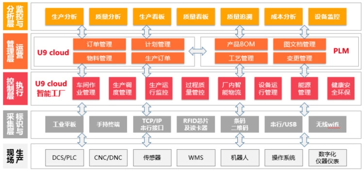 在制造执行与控制层,用友自主研发的U9 cloud智能工厂系统,全面覆盖制造企业人机料法环测等核心业务,包括:计划管理、作业管理、品质管理、物流管理、设备管理、工艺管理、人员管理和异常管理。