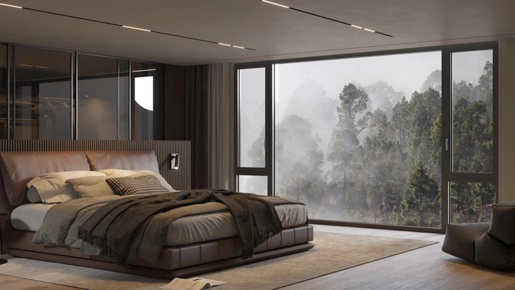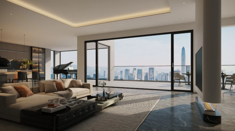 优选75系统窗以优异的保温隔热性,保障室内温度恒定,有效减少室内空调使用时间,大屏窗景满足城市的凭栏远眺,贴合设计师对新时代人居的设计定义。