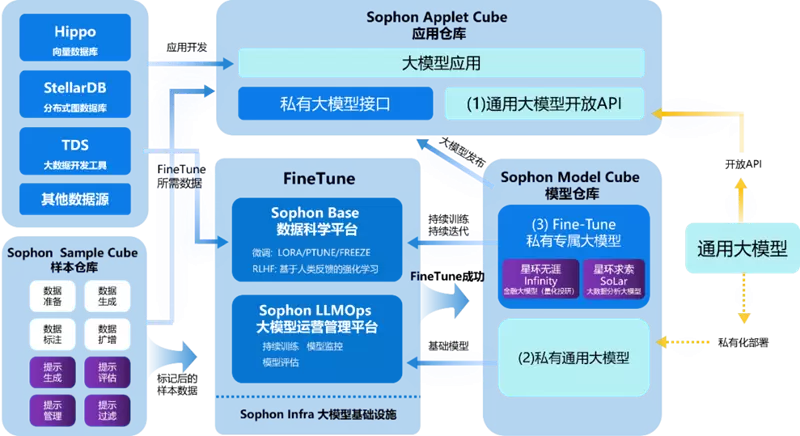 作为星环科技自主研发的一款综合性大模型统一运营管理平台,Sophon LLMOps为用户打通从数据接入和开发、提示工程、大模型微调、大模型上架部署到大模型应用编排和业务效果对齐的全链路流程,从而实现针对大模型的数据和分析的持续提升。