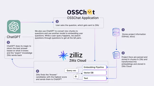 例如,Zilliz 的工程师就曾用两天的时间做出了 CVP Stack 的 OSSChat(https://osschat.io),用于解决开源项目文档冗长、不易查找等问题,目前已经支持几十个主流的开源项目,访问量巨大,用户甚至可以去生成开源项目的代码。