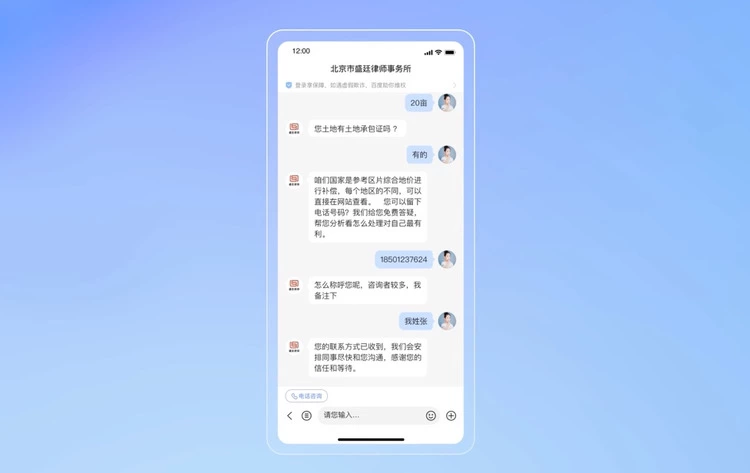 以法律咨询行业为例,在北京盛廷律师事务所客服接待中,「AI机器人」生动展示了其媲美真人的能力。「AI机器人」可根据顾客咨询的问题有针对性地核实信息、了解情况,通过拟人化沟通掌握顾客“咨询起诉和强制执行问题”的意图,成功获取顾客联系方式。
